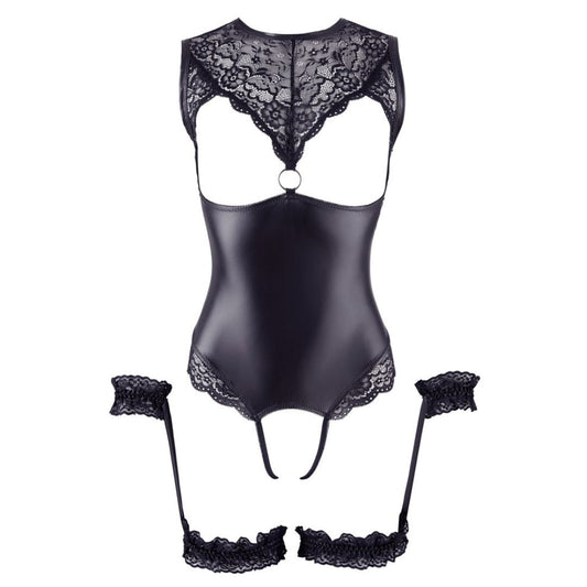 Strapsbody im Wetlook mit offenem Schritt und Armfesseln