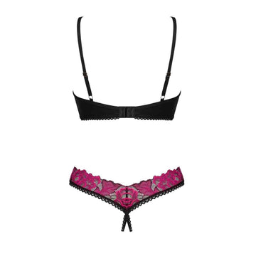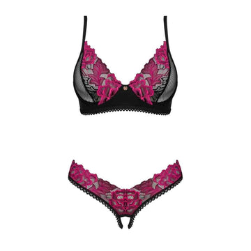 Rosige Verführung! Bügel-BH und String ouvert im Set Rosenty von Obsessive. Weiches schwarzes Netz und feine pinkfarbene Rosenspitze im stylischen Mix mit blickdichtem schwarzem Stretchmaterial. BH mit Schmuckelement zwischen den Bügel-Cups und verstellbarem Hakenverschluss im Rücken. Auch die Träger sind passend verstellbar. Der String mit schönem Spitzenbund ist im Schritt verführerisch offen.