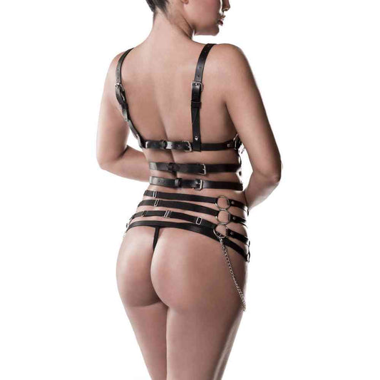 - Klassisch: Traditionelle Bondage-Elemente wie Riemen, Schnallen und O-Ringe sind in das Design integriert.