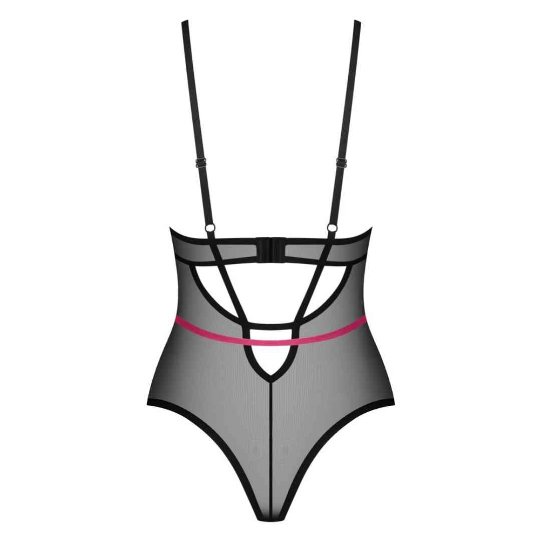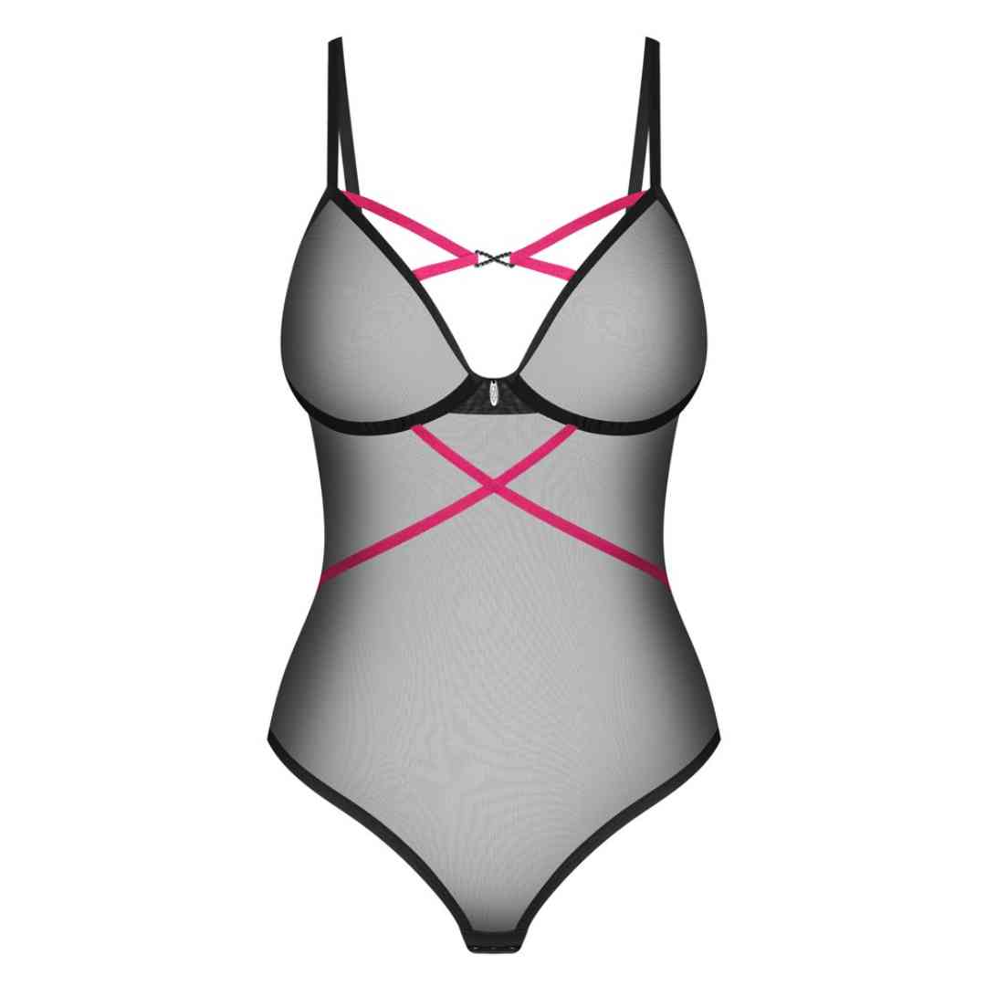 Stringbody Novenes von Obsessive aus feinem schwarzem Powernet mit pinkfarbenen Riemchen-Akzenten vorne und hinten. Weich und elastisch für hohen Tragekomfort. Zwischen den soften Cups mit Dekolleté-Riemchen und schönem Strasselement. Die Träger und der Hakenverschluss im freien Rücken sind passend verstellbar.