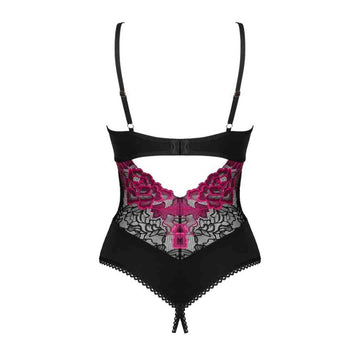 Bildschöner Eyecatcher mit offenem Schritt! Stringbody ouvert Rosenty von Obsessive in vorteilhafter knapper Schnittführung. Weiches schwarzes Netz und feine pinkfarbene Rosenspitze im stylischen Mix mit blickdichtem schwarzem Stretchmaterial. Mit kleinem Schmuckelement zwischen den Bügel-Cups. Im tiefen Rückenausschnitt mit verstellbarem Hakenverschluss. Auch die Träger sind passend verstellbar. Der Schritt mit zwei Stringriemchen ist verführerisch offen.