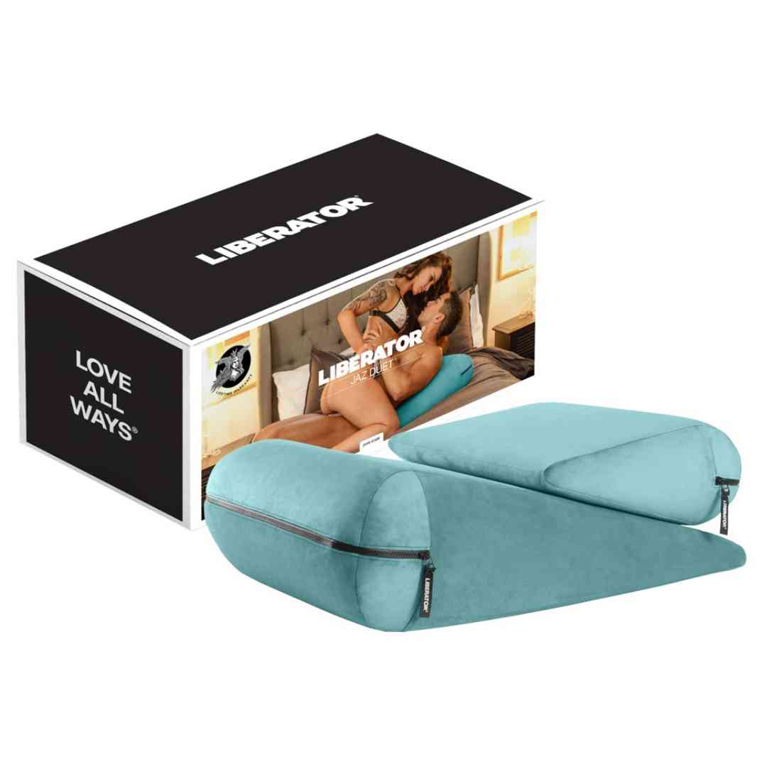 2 verschieden große, ergonomisch keilförmige Liebeskissen im Set Jaz Duet von Liberator. Mit soft-seidigen Mikrofaserbezügen, die rutschfest aufeinander haften. So kann das kleine Keilkissen individuell auf dem großen Keilkissen platziert werden. Beide Kissen sind selbstverständlich auch einzeln verwendbar. Die beiden festen Keilkissen sind die perfekte und komfortable Unterstützung bei Sex-Stellungen und oralen Spielarten.