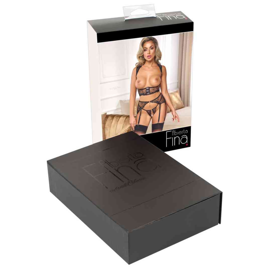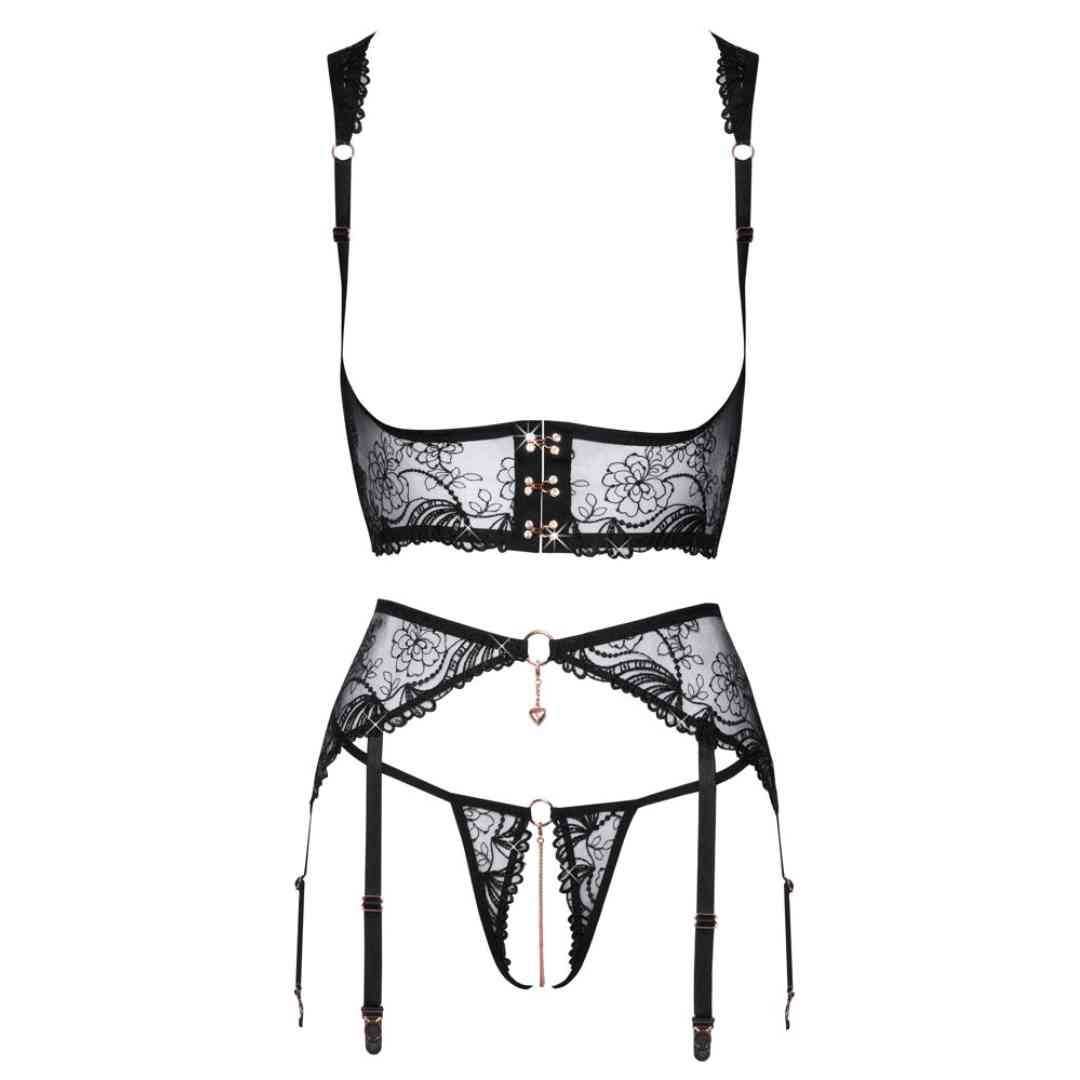 Busenfreies BH-Top, Strapsgürtel und String ouvert vereint im elegant erotischen Straps-Set von Abierta Fina. Aus feinem schwarzem Tüll gearbeitet, aufwendig bestickt und mit kleinen Pailletten verziert. Roségoldfarbene Accessoires runden das verführerische Styling ab. Länger geschnittener busenfreier BH mit schulterbedeckender Spitze. Im Nacken kleiner Verschluss. Unter der Brust mit glitzerndem Strass besetztem Hakenverschluss. Der zusätzliche Hakenverschluss im Rücken und die Träger sind vorne sowie hinten passend verstellbar. Strapsgürtel mit schönem Schmuckherz-Element vorne, Hakenverschluss hinten und insgesamt 6 verstellbaren Strumpfhaltern. Der kleine String verführt mit einem komplett offenem Schritt und stimulierender Kette, die auch abgenommen werden kann.