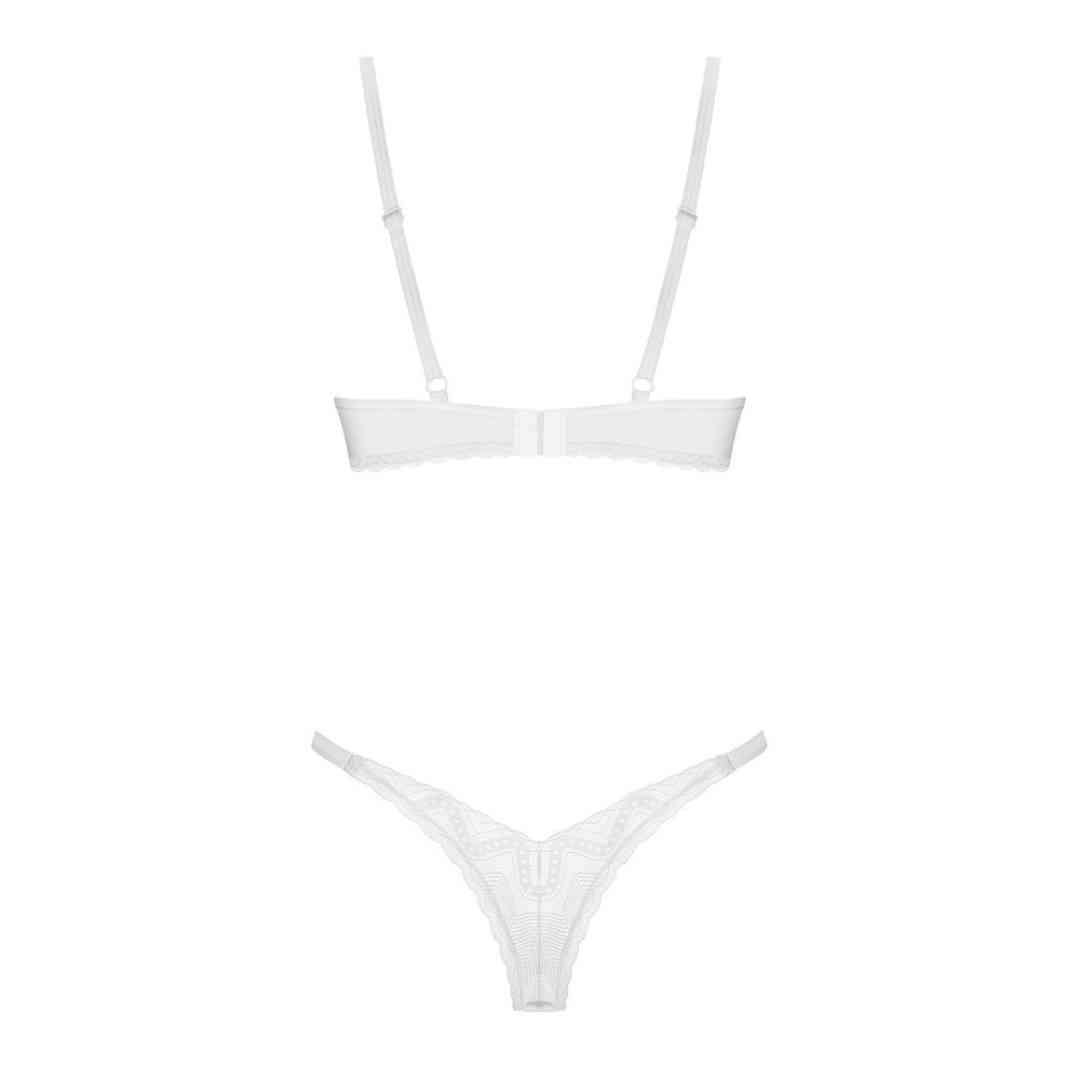 Set Alissium von Obsessive mit Soft-BH und Riostring in filigranen Spitzen-Optiken und charmanter Farbe: Zeitloses Weiß. Rundum weich und elastisch für hohen Tragekomfort. Zwischen den soften Cups mit dezentem Schmuckdetail. Die BH-Träger sind passend verstellbar.