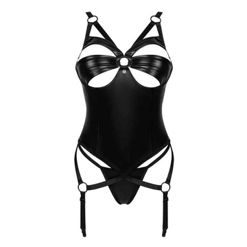 Aufregender Wetlook-Style! Figurbetonendes Strapshemd und String im Set Armares von Obsessive. Komplett im angesagten Wetlook, der sich elastisch und weich anschmiegt. Bügel-Cups mit verführerischen Cut-outs und kleinem Schmuckelement. Die mit Ringen raffiniert gestylten Träger- und Strapsriemen sind passend verstellbar – genauso wie die Hakenverschlussleiste im Rücken.